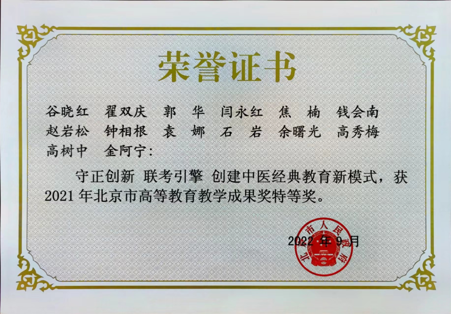 1. 2021年北京市高等教育教学成果奖特等奖:守正创新 联考引擎 创建中医经典教育新模式