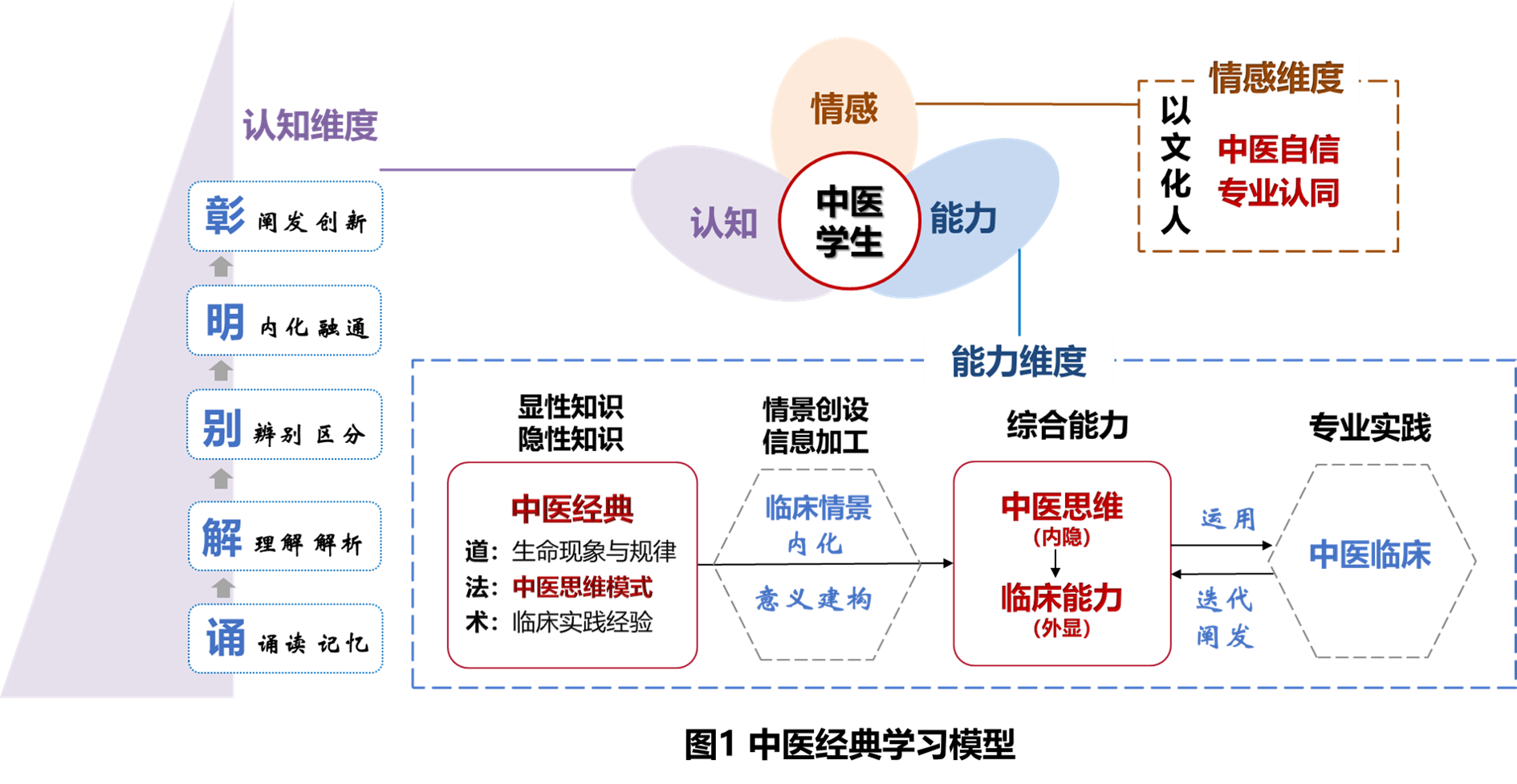 1.目标:将学生认知规律与中医学习方法相结合,以经典中的“诵、解、别、明、彰”作为逐级提高的认知目标,以中医思维与临床能力作为经典教育的能力目标,将中医文化自信作为情感目标。