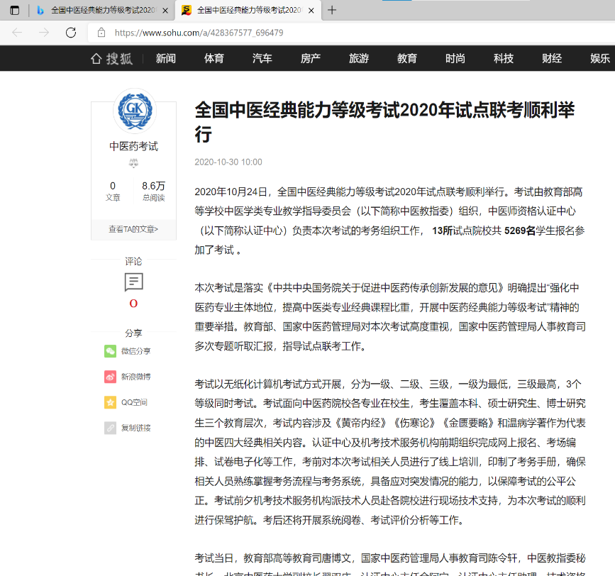 3. 全国中医经典能力等级考试2020年试点联考完成,搜狐中国教育新闻网,2020.10.30