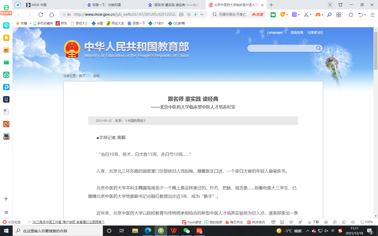 20.“跟名师 重实践 读经典”——北京中医药大学临床型中医人才培养纪实.教育部,2012年 5 月 22 日