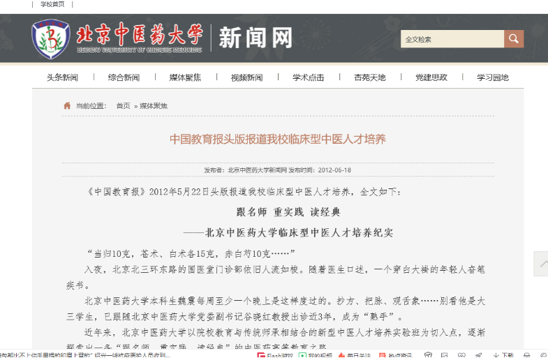 21.北京中医药大学人才培养:跟名师重实践读经典.中国教育报, 2012 年 5 月 22 日